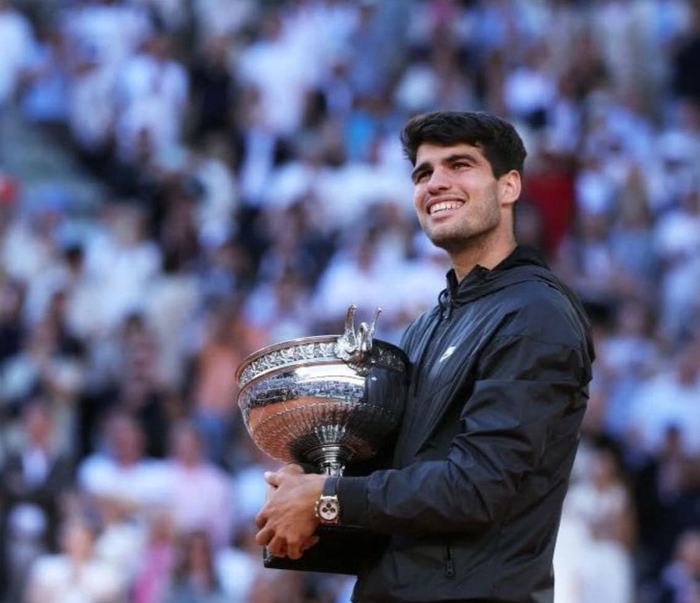 法网历史上用时最长决赛的冠军。2025年法网,阿尔卡拉斯和辛纳联袂上演了一场5小时29分钟的法网历史上用时最长的决赛。阿尔卡拉斯第四盘第九局挽救了辛纳三个连续的破发点兼冠军点,并在随后的第十局破掉了辛纳的发球冠军局,最后鏖战五盘,逆转战胜了辛纳,卫冕法网冠军,这是阿尔卡拉斯职业生涯第五个大满贯冠军。阿尔卡拉斯就此成为公开赛年代继瑞士球王费德勒之后第二位赢得职业生涯前五次大满贯决赛的选手,并且成为公开赛年代继瑞典冰山博格、西班牙战神纳达尔之后职业生涯夺取五个大满贯冠军第三年轻的选手。
